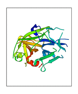 These views are prepared from three orthologuous viewpoints with MolScript. Secondary structures are determined from the C-alpha atom positions of your protein (N-terminal blue, C-terminal red).