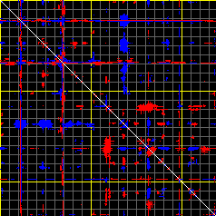 This matrix displays the maximum distance fluctuations between all pairs of CA atoms and between the two extreme conformations that were computed for this mode (DQMIN/DQMAX). Distance increases are plotted in blue and decreases in red for the strongest 10% of the residue pair distance changes. Every pixel corresponds to a single residue. Grey lines are drawn every 10 residues, yellow lines every 100 residues (counting from the upper left corner).