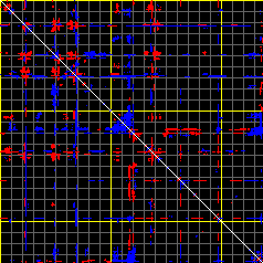 This matrix displays the maximum distance fluctuations between all pairs of CA atoms and between the two extreme conformations that were computed for this mode (DQMIN/DQMAX). Distance increases are plotted in blue and decreases in red for the strongest 10% of the residue pair distance changes. Every pixel corresponds to a single residue. Grey lines are drawn every 10 residues, yellow lines every 100 residues (counting from the upper left corner).