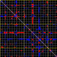 This matrix displays the maximum distance fluctuations between all pairs of CA atoms and between the two extreme conformations that were computed for this mode (DQMIN/DQMAX). Distance increases are plotted in blue and decreases in red for the strongest 10% of the residue pair distance changes. Every pixel corresponds to a single residue. Grey lines are drawn every 10 residues, yellow lines every 100 residues (counting from the upper left corner).
