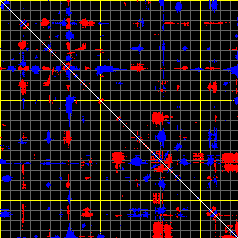 This matrix displays the maximum distance fluctuations between all pairs of CA atoms and between the two extreme conformations that were computed for this mode (DQMIN/DQMAX). Distance increases are plotted in blue and decreases in red for the strongest 10% of the residue pair distance changes. Every pixel corresponds to a single residue. Grey lines are drawn every 10 residues, yellow lines every 100 residues (counting from the upper left corner).
