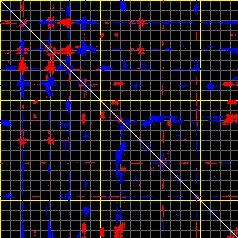 This matrix displays the maximum distance fluctuations between all pairs of CA atoms and between the two extreme conformations that were computed for this mode (DQMIN/DQMAX). Distance increases are plotted in blue and decreases in red for the strongest 10% of the residue pair distance changes. Every pixel corresponds to a single residue. Grey lines are drawn every 10 residues, yellow lines every 100 residues (counting from the upper left corner).