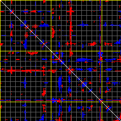 This matrix displays the maximum distance fluctuations between all pairs of CA atoms and between the two extreme conformations that were computed for this mode (DQMIN/DQMAX). Distance increases are plotted in blue and decreases in red for the strongest 10% of the residue pair distance changes. Every pixel corresponds to a single residue. Grey lines are drawn every 10 residues, yellow lines every 100 residues (counting from the upper left corner).