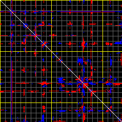 This matrix displays the maximum distance fluctuations between all pairs of CA atoms and between the two extreme conformations that were computed for this mode (DQMIN/DQMAX). Distance increases are plotted in blue and decreases in red for the strongest 10% of the residue pair distance changes. Every pixel corresponds to a single residue. Grey lines are drawn every 10 residues, yellow lines every 100 residues (counting from the upper left corner).