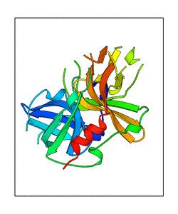 These views are prepared from three orthologuous viewpoints with MolScript. Secondary structures are determined from the C-alpha atom positions of your protein (N-terminal blue, C-terminal red).