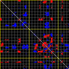 This matrix displays the maximum distance fluctuations between all pairs of CA atoms and between the two extreme conformations that were computed for this mode (DQMIN/DQMAX). Distance increases are plotted in blue and decreases in red for the strongest 10% of the residue pair distance changes. Every pixel corresponds to a single residue. Grey lines are drawn every 10 residues, yellow lines every 100 residues (counting from the upper left corner).