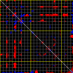 This matrix displays the maximum distance fluctuations between all pairs of CA atoms and between the two extreme conformations that were computed for this mode (DQMIN/DQMAX). Distance increases are plotted in blue and decreases in red for the strongest 10% of the residue pair distance changes. Every pixel corresponds to a single residue. Grey lines are drawn every 10 residues, yellow lines every 100 residues (counting from the upper left corner).