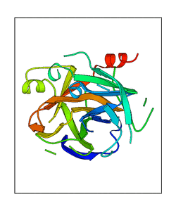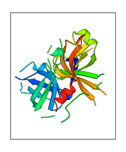 These views are prepared from three orthologuous viewpoints with MolScript. Secondary structures are determined from the C-alpha atom positions of your protein (N-terminal blue, C-terminal red).
