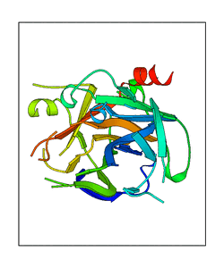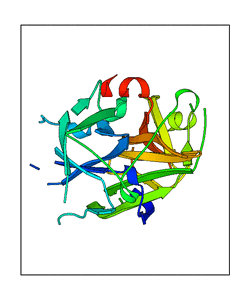 These views are prepared from three orthologuous viewpoints with MolScript. Secondary structures are determined from the C-alpha atom positions of your protein (N-terminal blue, C-terminal red).