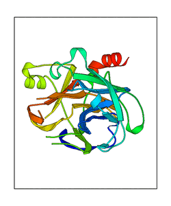 These views are prepared from three orthologuous viewpoints with MolScript. Secondary structures are determined from the C-alpha atom positions of your protein (N-terminal blue, C-terminal red).