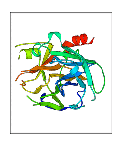 These views are prepared from three orthologuous viewpoints with MolScript. Secondary structures are determined from the C-alpha atom positions of your protein (N-terminal blue, C-terminal red).