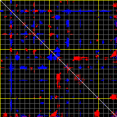 This matrix displays the maximum distance fluctuations between all pairs of CA atoms and between the two extreme conformations that were computed for this mode (DQMIN/DQMAX). Distance increases are plotted in blue and decreases in red for the strongest 10% of the residue pair distance changes. Every pixel corresponds to a single residue. Grey lines are drawn every 10 residues, yellow lines every 100 residues (counting from the upper left corner).