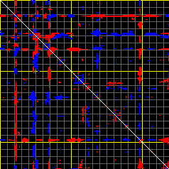 This matrix displays the maximum distance fluctuations between all pairs of CA atoms and between the two extreme conformations that were computed for this mode (DQMIN/DQMAX). Distance increases are plotted in blue and decreases in red for the strongest 10% of the residue pair distance changes. Every pixel corresponds to a single residue. Grey lines are drawn every 10 residues, yellow lines every 100 residues (counting from the upper left corner).