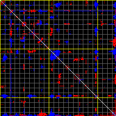 This matrix displays the maximum distance fluctuations between all pairs of CA atoms and between the two extreme conformations that were computed for this mode (DQMIN/DQMAX). Distance increases are plotted in blue and decreases in red for the strongest 10% of the residue pair distance changes. Every pixel corresponds to a single residue. Grey lines are drawn every 10 residues, yellow lines every 100 residues (counting from the upper left corner).