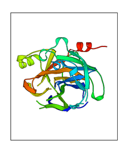 These views are prepared from three orthologuous viewpoints with MolScript. Secondary structures are determined from the C-alpha atom positions of your protein (N-terminal blue, C-terminal red).