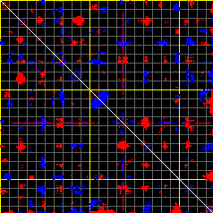 This matrix displays the maximum distance fluctuations between all pairs of CA atoms and between the two extreme conformations that were computed for this mode (DQMIN/DQMAX). Distance increases are plotted in blue and decreases in red for the strongest 10% of the residue pair distance changes. Every pixel corresponds to a single residue. Grey lines are drawn every 10 residues, yellow lines every 100 residues (counting from the upper left corner).