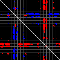 This matrix displays the maximum distance fluctuations between all pairs of CA atoms and between the two extreme conformations that were computed for this mode (DQMIN/DQMAX). Distance increases are plotted in blue and decreases in red for the strongest 10% of the residue pair distance changes. Every pixel corresponds to a single residue. Grey lines are drawn every 10 residues, yellow lines every 100 residues (counting from the upper left corner).