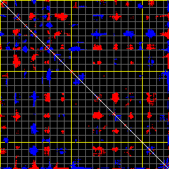 This matrix displays the maximum distance fluctuations between all pairs of CA atoms and between the two extreme conformations that were computed for this mode (DQMIN/DQMAX). Distance increases are plotted in blue and decreases in red for the strongest 10% of the residue pair distance changes. Every pixel corresponds to a single residue. Grey lines are drawn every 10 residues, yellow lines every 100 residues (counting from the upper left corner).
