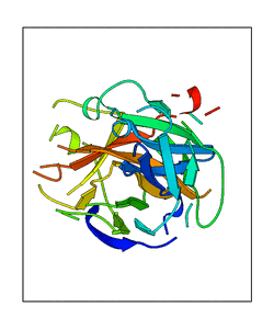 These views are prepared from three orthologuous viewpoints with MolScript. Secondary structures are determined from the C-alpha atom positions of your protein (N-terminal blue, C-terminal red).