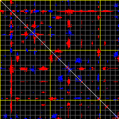 This matrix displays the maximum distance fluctuations between all pairs of CA atoms and between the two extreme conformations that were computed for this mode (DQMIN/DQMAX). Distance increases are plotted in blue and decreases in red for the strongest 10% of the residue pair distance changes. Every pixel corresponds to a single residue. Grey lines are drawn every 10 residues, yellow lines every 100 residues (counting from the upper left corner).