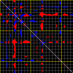 This matrix displays the maximum distance fluctuations between all pairs of CA atoms and between the two extreme conformations that were computed for this mode (DQMIN/DQMAX). Distance increases are plotted in blue and decreases in red for the strongest 10% of the residue pair distance changes. Every pixel corresponds to a single residue. Grey lines are drawn every 10 residues, yellow lines every 100 residues (counting from the upper left corner).