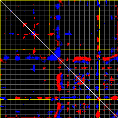 This matrix displays the maximum distance fluctuations between all pairs of CA atoms and between the two extreme conformations that were computed for this mode (DQMIN/DQMAX). Distance increases are plotted in blue and decreases in red for the strongest 10% of the residue pair distance changes. Every pixel corresponds to a single residue. Grey lines are drawn every 10 residues, yellow lines every 100 residues (counting from the upper left corner).