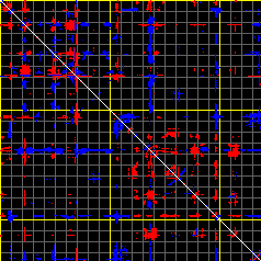 This matrix displays the maximum distance fluctuations between all pairs of CA atoms and between the two extreme conformations that were computed for this mode (DQMIN/DQMAX). Distance increases are plotted in blue and decreases in red for the strongest 10% of the residue pair distance changes. Every pixel corresponds to a single residue. Grey lines are drawn every 10 residues, yellow lines every 100 residues (counting from the upper left corner).