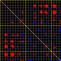 This matrix displays the maximum distance fluctuations between all pairs of CA atoms and between the two extreme conformations that were computed for this mode (DQMIN/DQMAX). Distance increases are plotted in blue and decreases in red for the strongest 10% of the residue pair distance changes. Every pixel corresponds to a single residue. Grey lines are drawn every 10 residues, yellow lines every 100 residues (counting from the upper left corner).