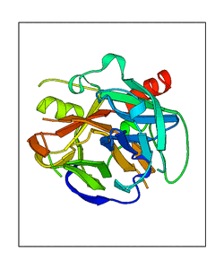 These views are prepared from three orthologuous viewpoints with MolScript. Secondary structures are determined from the C-alpha atom positions of your protein (N-terminal blue, C-terminal red).