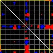 This matrix displays the maximum distance fluctuations between all pairs of CA atoms and between the two extreme conformations that were computed for this mode (DQMIN/DQMAX). Distance increases are plotted in blue and decreases in red for the strongest 10% of the residue pair distance changes. Every pixel corresponds to a single residue. Grey lines are drawn every 10 residues, yellow lines every 100 residues (counting from the upper left corner).