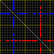 This matrix displays the maximum distance fluctuations between all pairs of CA atoms and between the two extreme conformations that were computed for this mode (DQMIN/DQMAX). Distance increases are plotted in blue and decreases in red for the strongest 10% of the residue pair distance changes. Every pixel corresponds to a single residue. Grey lines are drawn every 10 residues, yellow lines every 100 residues (counting from the upper left corner).