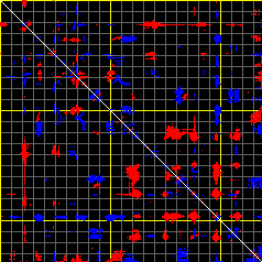 This matrix displays the maximum distance fluctuations between all pairs of CA atoms and between the two extreme conformations that were computed for this mode (DQMIN/DQMAX). Distance increases are plotted in blue and decreases in red for the strongest 10% of the residue pair distance changes. Every pixel corresponds to a single residue. Grey lines are drawn every 10 residues, yellow lines every 100 residues (counting from the upper left corner).