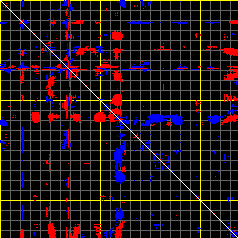 This matrix displays the maximum distance fluctuations between all pairs of CA atoms and between the two extreme conformations that were computed for this mode (DQMIN/DQMAX). Distance increases are plotted in blue and decreases in red for the strongest 10% of the residue pair distance changes. Every pixel corresponds to a single residue. Grey lines are drawn every 10 residues, yellow lines every 100 residues (counting from the upper left corner).