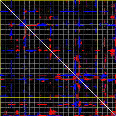 This matrix displays the maximum distance fluctuations between all pairs of CA atoms and between the two extreme conformations that were computed for this mode (DQMIN/DQMAX). Distance increases are plotted in blue and decreases in red for the strongest 10% of the residue pair distance changes. Every pixel corresponds to a single residue. Grey lines are drawn every 10 residues, yellow lines every 100 residues (counting from the upper left corner).
