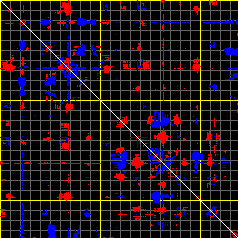 This matrix displays the maximum distance fluctuations between all pairs of CA atoms and between the two extreme conformations that were computed for this mode (DQMIN/DQMAX). Distance increases are plotted in blue and decreases in red for the strongest 10% of the residue pair distance changes. Every pixel corresponds to a single residue. Grey lines are drawn every 10 residues, yellow lines every 100 residues (counting from the upper left corner).