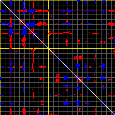 This matrix displays the maximum distance fluctuations between all pairs of CA atoms and between the two extreme conformations that were computed for this mode (DQMIN/DQMAX). Distance increases are plotted in blue and decreases in red for the strongest 10% of the residue pair distance changes. Every pixel corresponds to a single residue. Grey lines are drawn every 10 residues, yellow lines every 100 residues (counting from the upper left corner).