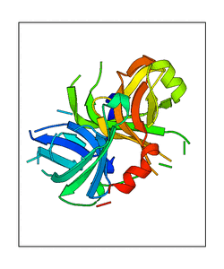 These views are prepared from three orthologuous viewpoints with MolScript. Secondary structures are determined from the C-alpha atom positions of your protein (N-terminal blue, C-terminal red).
