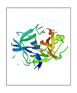 These views are prepared from three orthologuous viewpoints with MolScript. Secondary structures are determined from the C-alpha atom positions of your protein (N-terminal blue, C-terminal red).