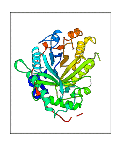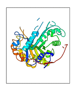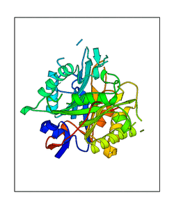 These views are prepared from three orthologuous viewpoints with MolScript. Secondary structures are determined from the C-alpha atom positions of your protein (N-terminal blue, C-terminal red).