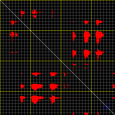 This matrix displays the maximum distance fluctuations between all pairs of CA atoms and between the two extreme conformations that were computed for this mode (DQMIN/DQMAX). Distance increases are plotted in blue and decreases in red for the strongest 10% of the residue pair distance changes. Every pixel corresponds to a single residue. Grey lines are drawn every 10 residues, yellow lines every 100 residues (counting from the upper left corner).
