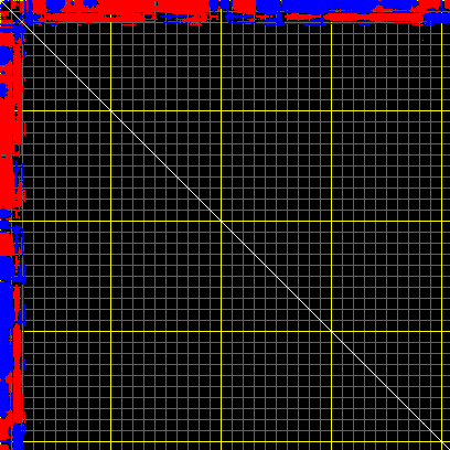 This matrix displays the maximum distance fluctuations between all pairs of CA atoms and between the two extreme conformations that were computed for this mode (DQMIN/DQMAX). Distance increases are plotted in blue and decreases in red for the strongest 10% of the residue pair distance changes. Every pixel corresponds to a single residue. Grey lines are drawn every 10 residues, yellow lines every 100 residues (counting from the upper left corner).