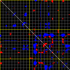 This matrix displays the maximum distance fluctuations between all pairs of CA atoms and between the two extreme conformations that were computed for this mode (DQMIN/DQMAX). Distance increases are plotted in blue and decreases in red for the strongest 10% of the residue pair distance changes. Every pixel corresponds to a single residue. Grey lines are drawn every 10 residues, yellow lines every 100 residues (counting from the upper left corner).