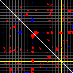 This matrix displays the maximum distance fluctuations between all pairs of CA atoms and between the two extreme conformations that were computed for this mode (DQMIN/DQMAX). Distance increases are plotted in blue and decreases in red for the strongest 10% of the residue pair distance changes. Every pixel corresponds to a single residue. Grey lines are drawn every 10 residues, yellow lines every 100 residues (counting from the upper left corner).