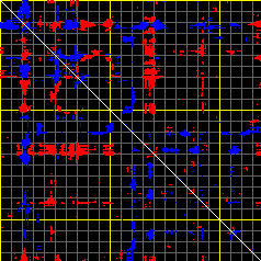 This matrix displays the maximum distance fluctuations between all pairs of CA atoms and between the two extreme conformations that were computed for this mode (DQMIN/DQMAX). Distance increases are plotted in blue and decreases in red for the strongest 10% of the residue pair distance changes. Every pixel corresponds to a single residue. Grey lines are drawn every 10 residues, yellow lines every 100 residues (counting from the upper left corner).