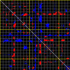 This matrix displays the maximum distance fluctuations between all pairs of CA atoms and between the two extreme conformations that were computed for this mode (DQMIN/DQMAX). Distance increases are plotted in blue and decreases in red for the strongest 10% of the residue pair distance changes. Every pixel corresponds to a single residue. Grey lines are drawn every 10 residues, yellow lines every 100 residues (counting from the upper left corner).