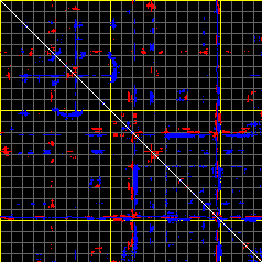 This matrix displays the maximum distance fluctuations between all pairs of CA atoms and between the two extreme conformations that were computed for this mode (DQMIN/DQMAX). Distance increases are plotted in blue and decreases in red for the strongest 10% of the residue pair distance changes. Every pixel corresponds to a single residue. Grey lines are drawn every 10 residues, yellow lines every 100 residues (counting from the upper left corner).