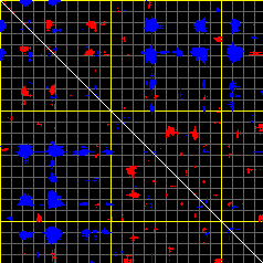 This matrix displays the maximum distance fluctuations between all pairs of CA atoms and between the two extreme conformations that were computed for this mode (DQMIN/DQMAX). Distance increases are plotted in blue and decreases in red for the strongest 10% of the residue pair distance changes. Every pixel corresponds to a single residue. Grey lines are drawn every 10 residues, yellow lines every 100 residues (counting from the upper left corner).