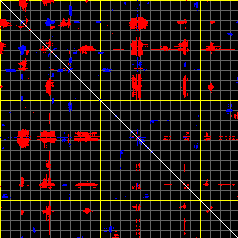 This matrix displays the maximum distance fluctuations between all pairs of CA atoms and between the two extreme conformations that were computed for this mode (DQMIN/DQMAX). Distance increases are plotted in blue and decreases in red for the strongest 10% of the residue pair distance changes. Every pixel corresponds to a single residue. Grey lines are drawn every 10 residues, yellow lines every 100 residues (counting from the upper left corner).