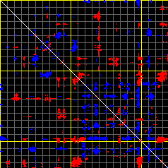 This matrix displays the maximum distance fluctuations between all pairs of CA atoms and between the two extreme conformations that were computed for this mode (DQMIN/DQMAX). Distance increases are plotted in blue and decreases in red for the strongest 10% of the residue pair distance changes. Every pixel corresponds to a single residue. Grey lines are drawn every 10 residues, yellow lines every 100 residues (counting from the upper left corner).