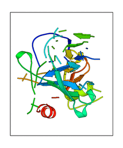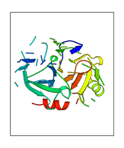 These views are prepared from three orthologuous viewpoints with MolScript. Secondary structures are determined from the C-alpha atom positions of your protein (N-terminal blue, C-terminal red).